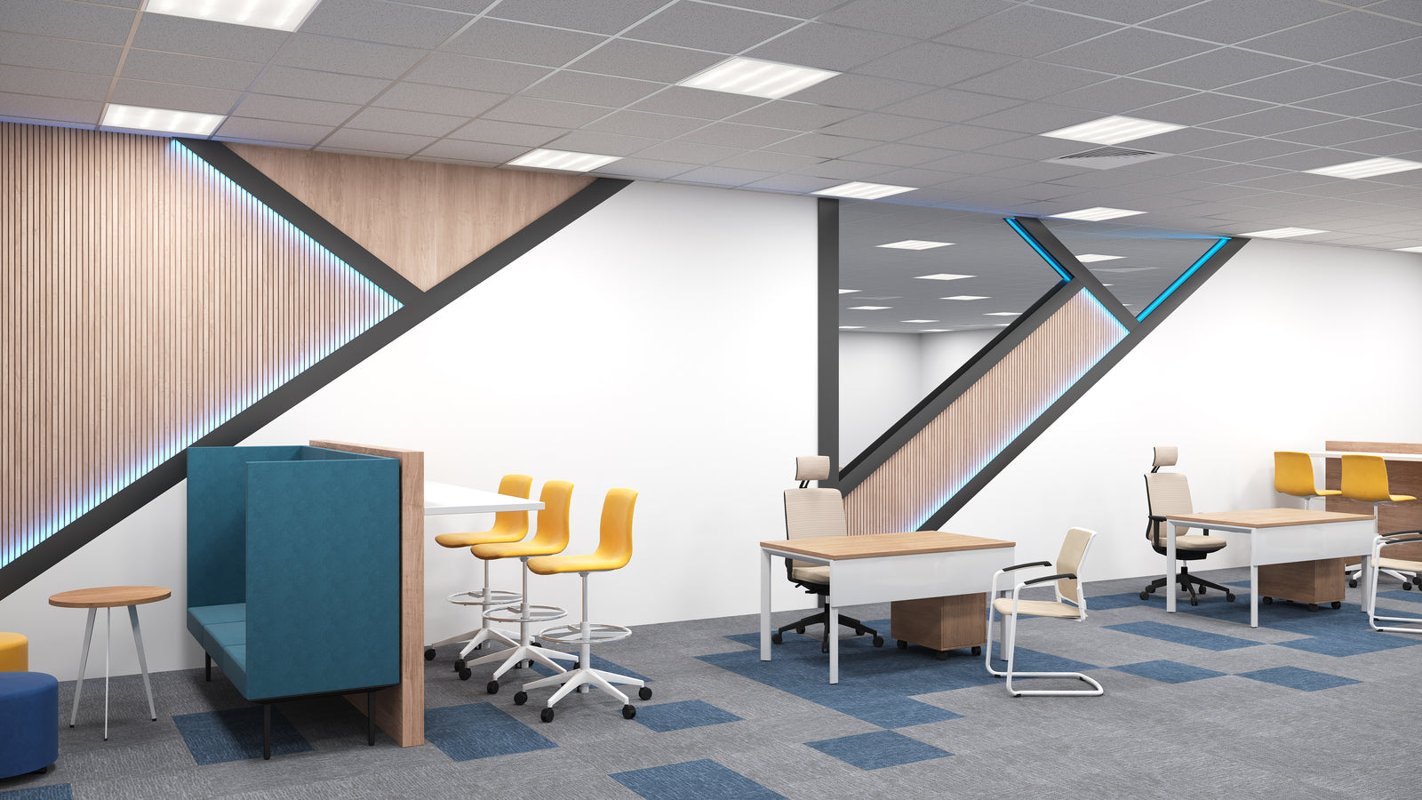 Newly added collaboration hubs, lounge areas, and café-style zones foster informal interactions, ideation, and cross-team visibility. These changes have led to increased voluntary use of shared areas and a measurable rise in employee engagement.