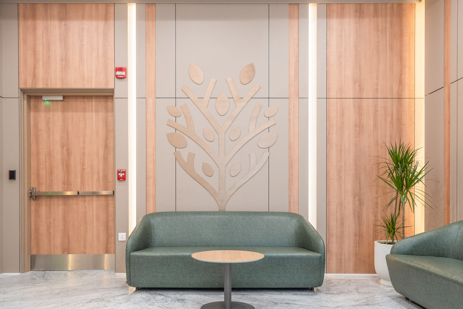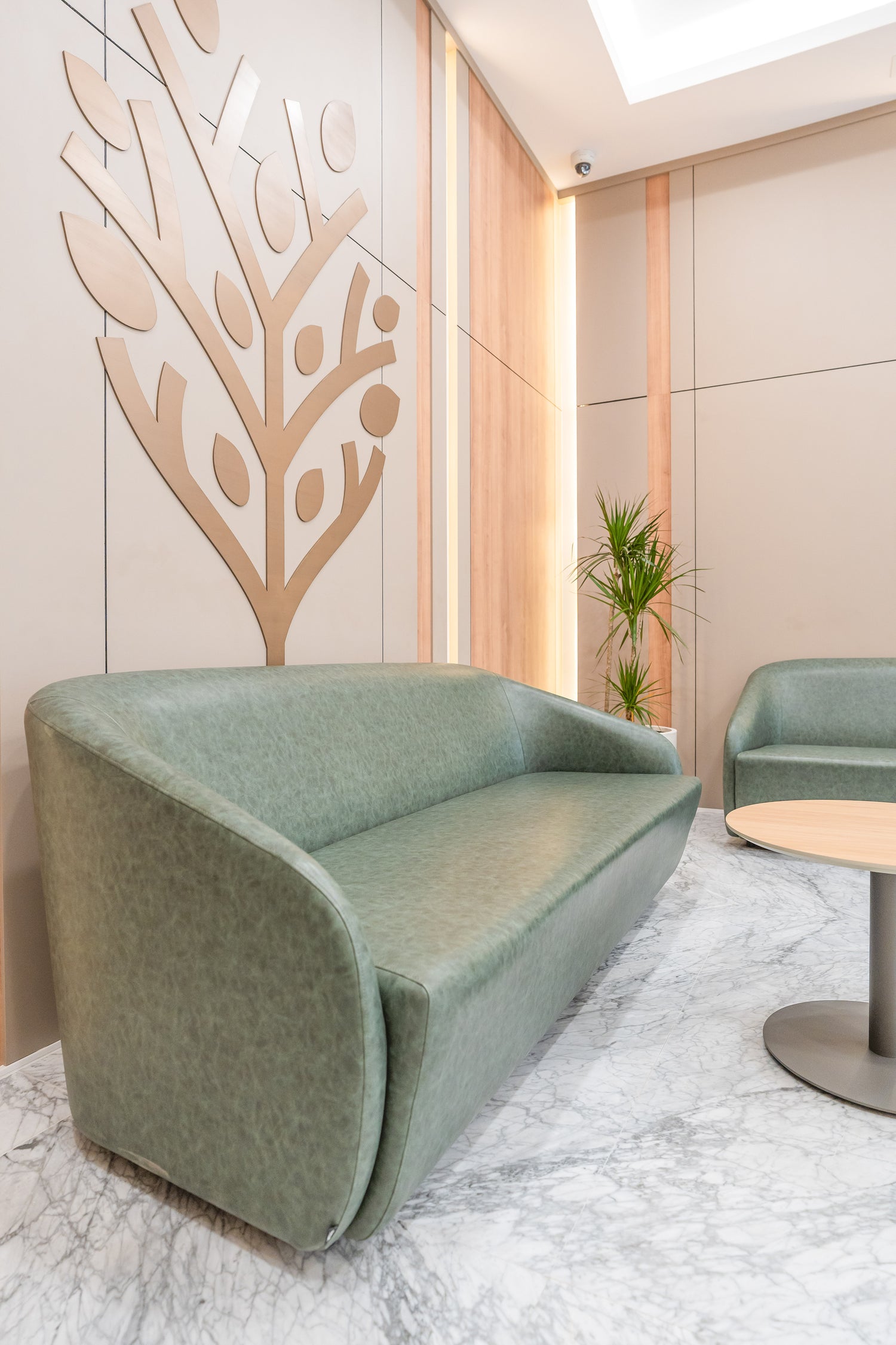 The carpet and furniture palette was chosen to enhance visual harmony, support acoustics, and maintain the clinic’s clean and sophisticated identity.