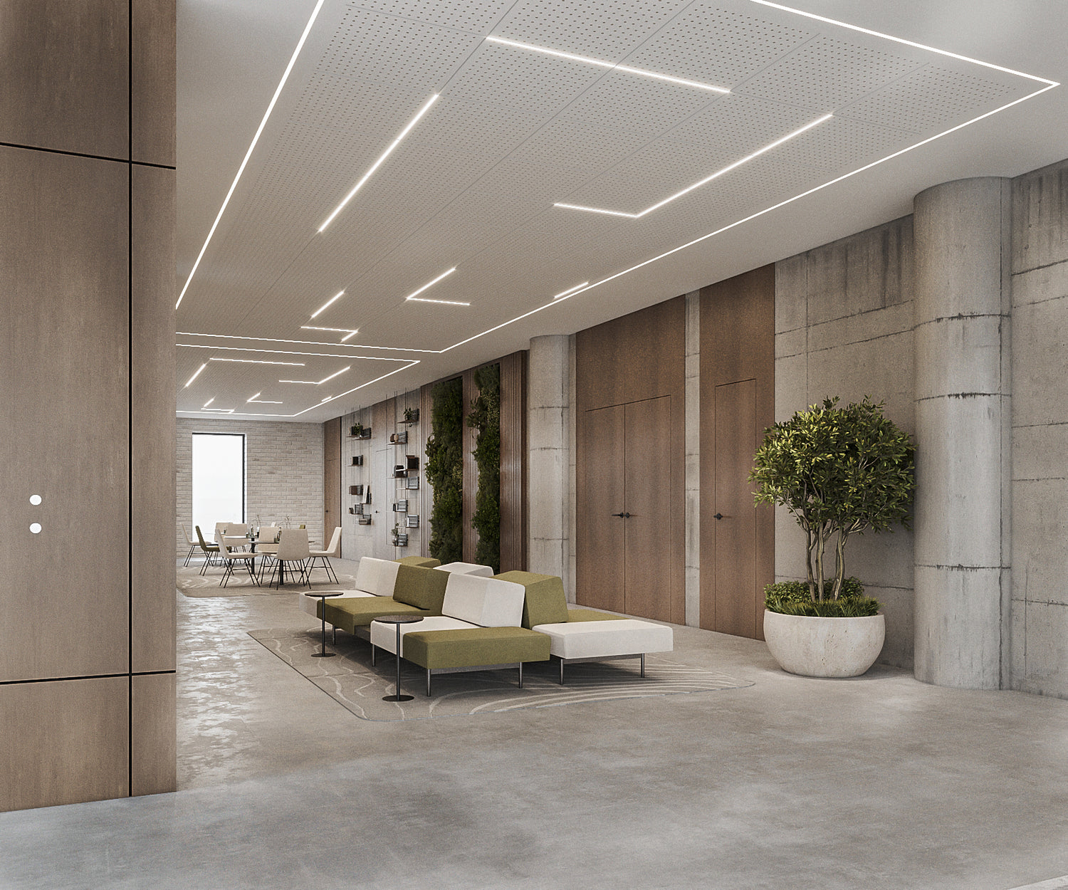 Beyond furniture, the proposal includes a comprehensive fit-out renovation, transforming walls, flooring, and ceilings with high-end finishes, innovative textures, and seamless architectural detailing. The result is a sleek, modern workspace that aligns with GOSI’s vision while setting a new standard for office interiors in Saudi Arabia.